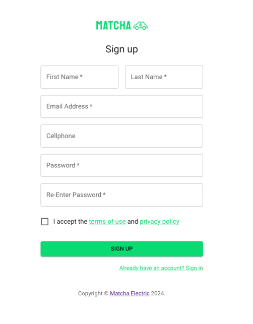 Use ➡️ this link to sign-up for a new Matcha user account. Enter your name, email, and password, review the terms of use, and click the Sign-up button.